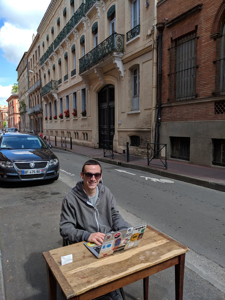 身為自由接案者,彭提斯通常選擇在家裡、咖啡廳、圖書館或付費制的共同工作空間工作。上周五,他真的搬了桌椅、按時付了停車費,在舊金山的路邊開始工作。期間遇到收費員經過、被檢舉遭警察關心,但仍安然無恙地度過了一天。