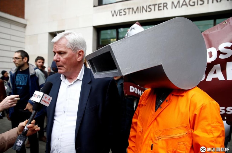 在《維基解密》創辦人阿桑奇(WikiLeaks)創辦人阿桑奇(Julian Assange)即將現身的威斯敏斯特裁判法院(Westminster Magistrates Court)前,《維基解密》編輯哈芬遜(Kristinn Hrafnsson)帶著打扮成吹哨人的抗議民眾一起聲援阿桑奇。