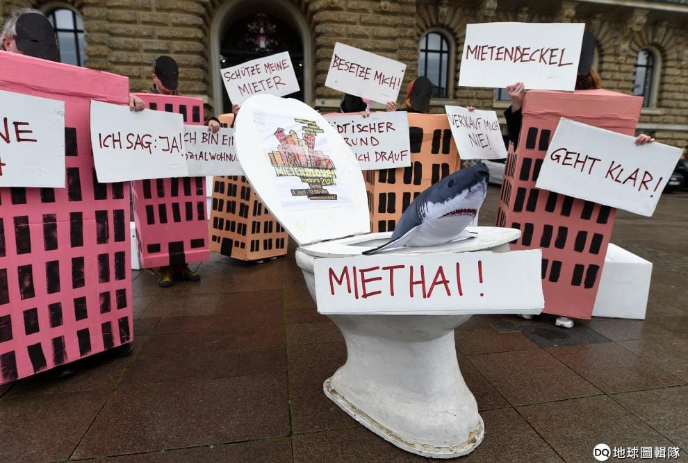 在漢堡市街頭,抗議城市士紳化(gentrification)讓房租高漲的民眾,帶著道具上街進行了一場行動藝術。