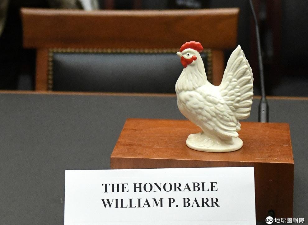 沒有出席美國眾議院司法委員會(House Judiciary Committee)聽證會的美國司法部長巴爾(William P. Barr),他的位子被民主黨眾議員放上了象徵膽小鬼的公雞雕像,原本這場聽證會想要討論他如何處理調查美國總統川普(Donald Trump)是否通俄的《穆勒報告》。