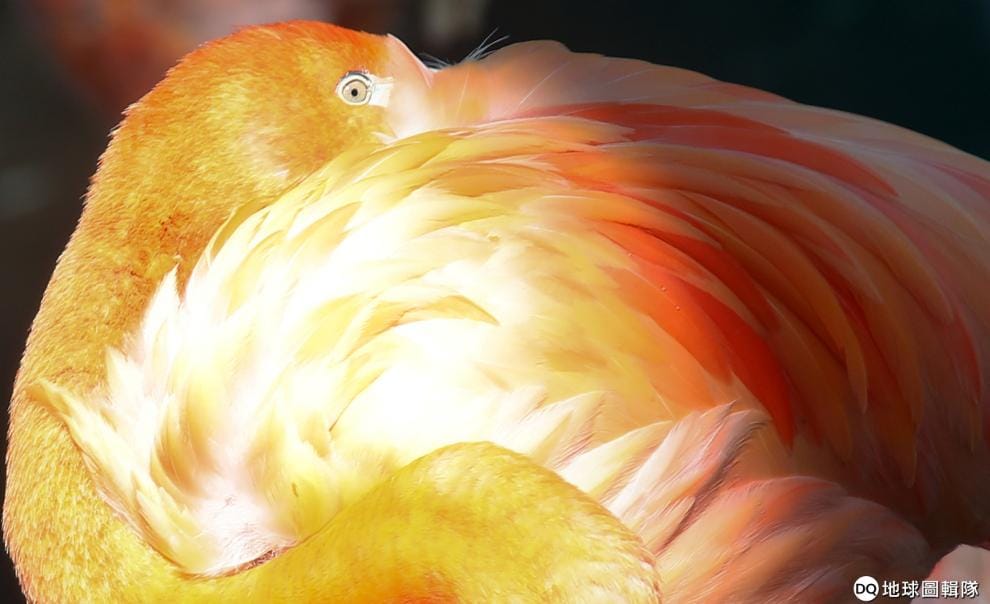 在慕尼黑的海拉布倫動物園(Hellabrunn zoo),一隻紅鶴把頭埋在羽毛裡,只露出眼睛觀察著周遭。
