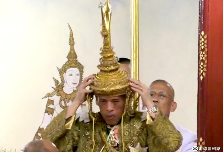 在這張取自電視影像的圖片中,新任泰王瓦吉拉隆功(Maha Vajiralongkorn)戴上華麗的冠冕,正式宣告成為泰國國王。