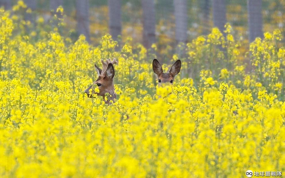 在白羅斯一處開滿黃花的花田中,躲著兩隻鹿。