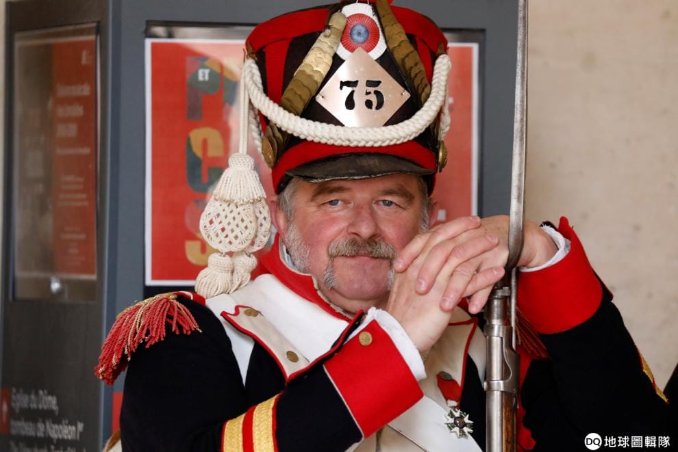 在有拿破崙一世(Napoléon)陵墓的巴黎榮軍院,一名愛好歷史的民眾打扮成拿破崙統治時期下的軍人,參加一年一度為拿破崙和戰死沙場的將士舉辦的彌撒。