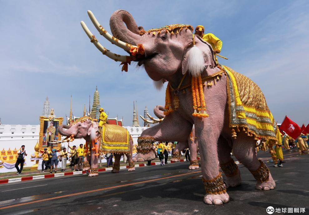 在曼谷大皇宮前,來自曼谷北方大城府(Ayutthaya)營地的 10頭大象特地前來為新泰皇瓦吉拉隆功(Maha Vajiralongkorn)慶祝。