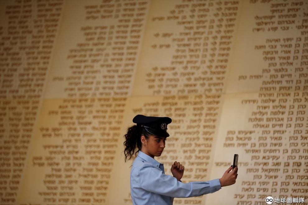 在耶路撒冷刻著陣亡將士姓名的紀念碑前,一名女警拿起手機自拍,準備迎接以色列陣亡將士紀念日(Yom Hazikaron)。