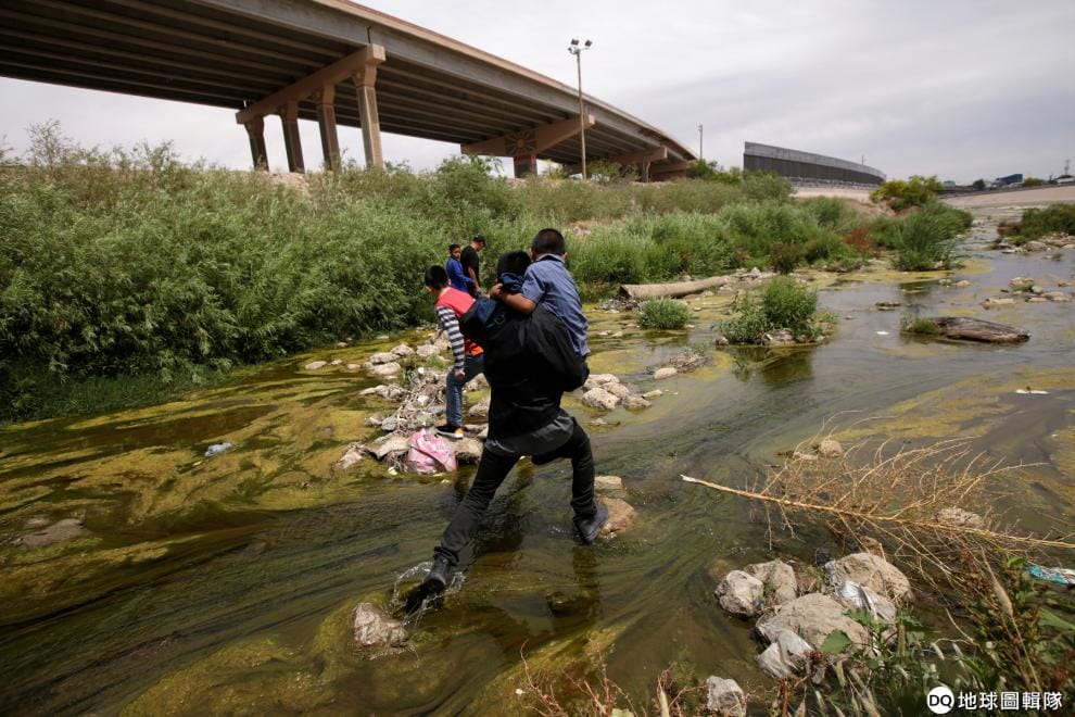 在美墨邊界的華瑞茲城(Ciudad Juarez),移民橫跨布拉沃河(Bravo river)準備前進德州艾爾帕索城(El Paso)尋求更好的生活。