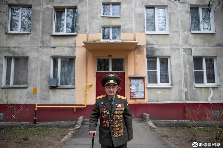 在莫斯科北部,今年 100歲的二戰退伍老兵巴加耶夫(Nikolay Bagayev)穿著別滿勳章的軍服,站在公寓前留影。