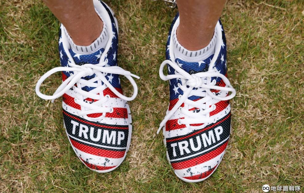 在佛羅里達州的巴拿馬市,一名美國總統川普(Donald Trump)的支持者腳踩特別訂製的川普球鞋,等待川普到活動現場。