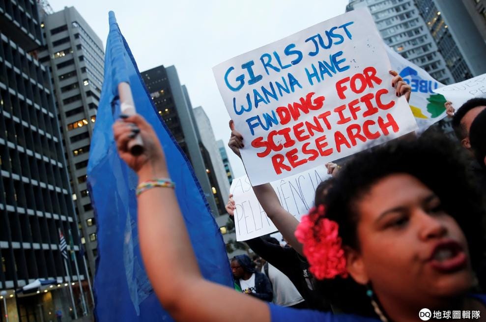 在巴西大城聖保羅(Sao Paulo),大學生們高舉海報和旗幟抗議總統波梭奈羅(Jair Bolsonaro)大砍聯邦教育經費的政策。其中,一名抗議者手上高舉的海報寫到「女孩們只是想要做科學研究的經費」。
