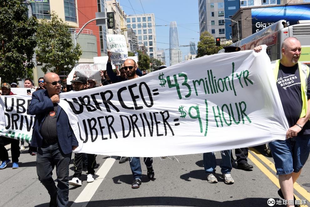 在加州舊金山市的金融區,UBER司機舉著旗幟上街抗議,旗幟上寫著「UBER CEO 年薪 4,300萬美元,UBER司機時薪 9美元」,他們希望UBER可以支付他們更合理的薪水,以及讓整個薪資計算的方式更加透明。
