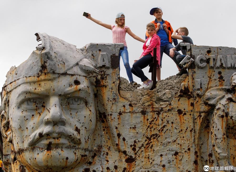 在反政府軍把持的烏克蘭東部頓內次克(Donetsk)地區,孩子們爬上巨大的二戰紀念雕像拍照,慶祝勝利日的到來。