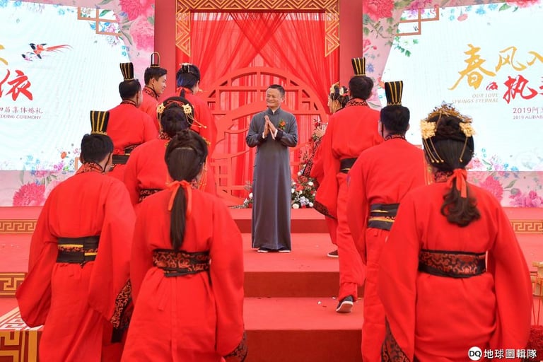 在浙江省杭州市,阿里巴巴集團共同創辦人馬雲正在為旗下員工主持集團婚禮。