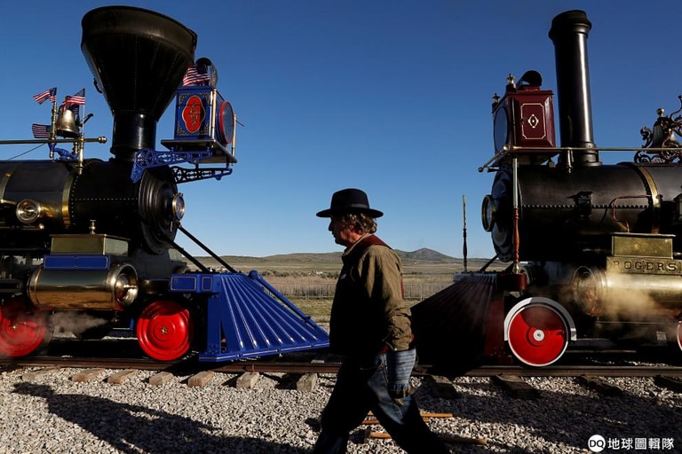 在位於猶他州的金色道釘國家歷史公園內,工作人員傑佛瑞(Patrick Jeffrey)走過木星號蒸氣火車的複製品,當地正在舉行州際鐵路完工 150年的慶祝活動。