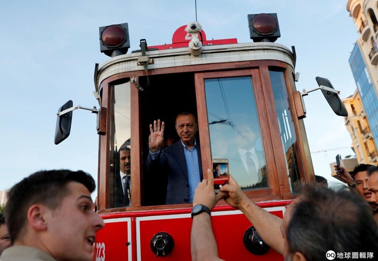 在塔克西姆廣場(Taksim Square)上,土耳其總統站在有軌電車上和他的支持者打招呼。