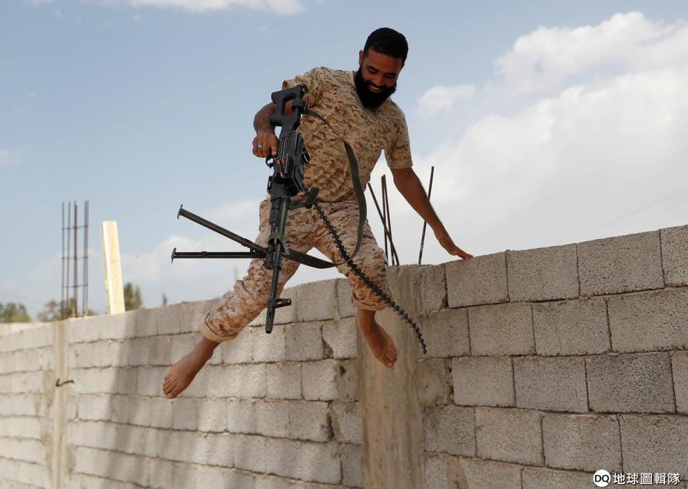 一名隸屬國際承認的利比亞政府軍成員在開完槍後,從圍牆上一躍而下。
