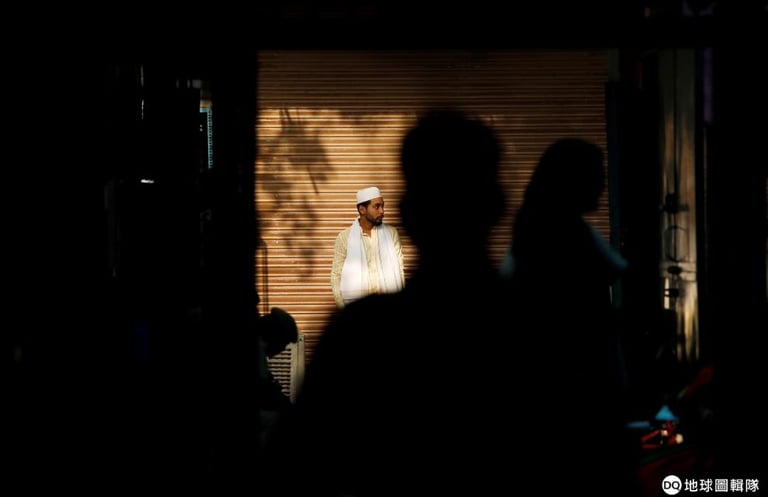 一名男子站在位於德里(Delhi)舊區的投票所外,等著要進行第 6階段的投票。