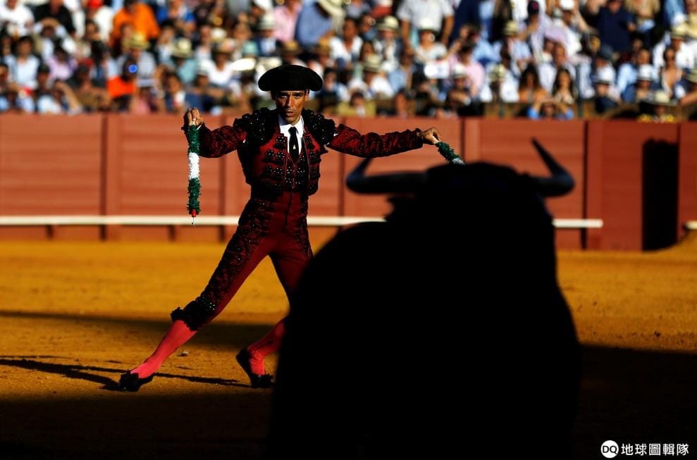 在位於城市塞維亞(Seville)的鬥牛場,鬥牛士戈摩茲(Angel Gomez)拿著長鉤(banderillas)和眼前的公牛對峙著。