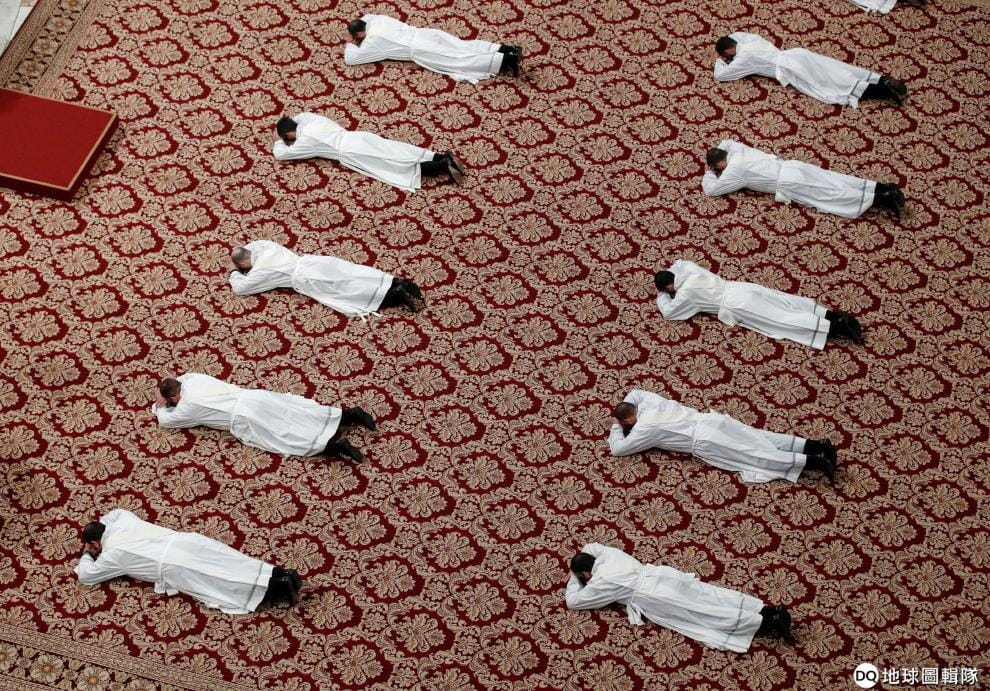 剛剛成為神父的人們紛紛趴臥在地上,聽著羅馬天主教教宗方濟各(Pope Francis,不在畫面中)進行彌撒。