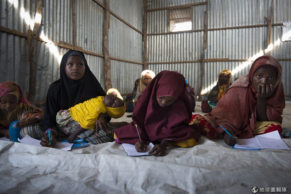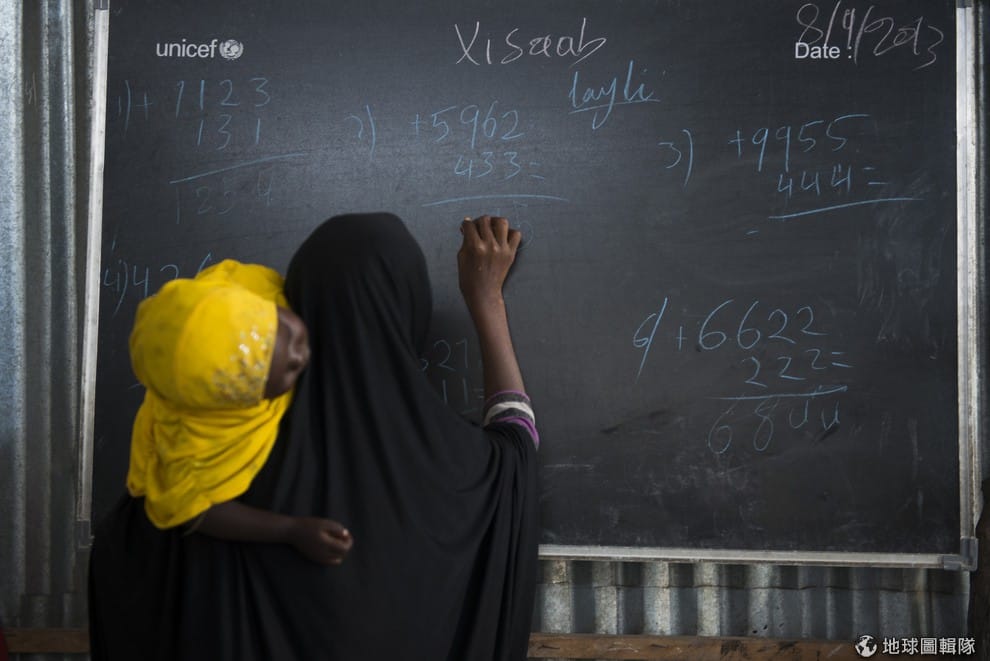 上圖為聯合國兒童基金會(Unicef)提供的索馬利亞小孩上學照片。由於爸媽都要工作,13歲的伊斯瑪汗(Ismahan)只好抱著 3歲的妹妹到學校上課。