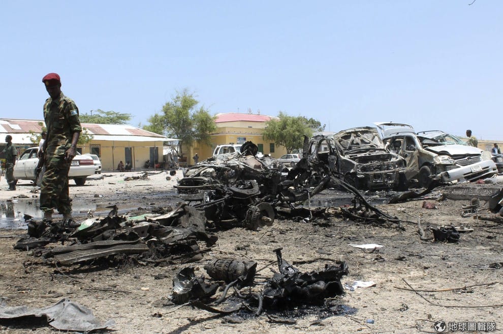 照片中為伊斯蘭青年黨於上星期 7號以自殺炸彈攻擊餐廳後,所留下的燒毀汽車殘骸。