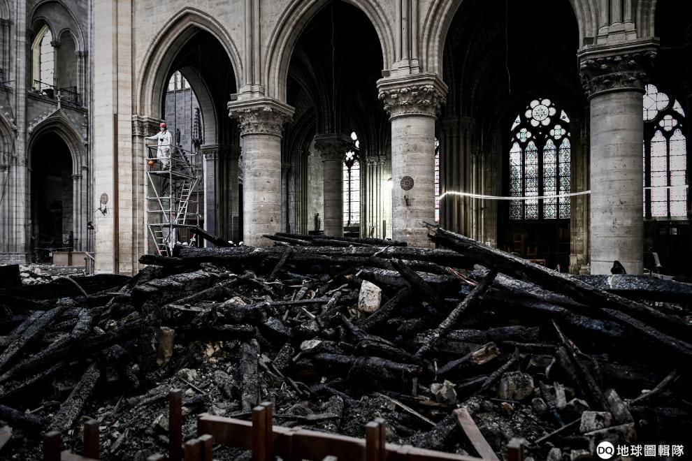 在巴黎聖母院(Notre-Dame Cathedral)裡,一名工人行走在因為火災造成的瓦礫之間,這裡已經開始了初步的復原作業。
