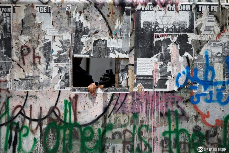 在伯利恆(Bethlehem)以色列佔領區,以色列邊境警察瞄準著前方的巴勒斯坦示威人潮。巴勒斯坦的示威者走上街頭,除了是因為巴勒斯坦災難日(Nakba Day)邁入 71周年,也是對以色列主辦歐洲歌唱大賽一事表達不滿。