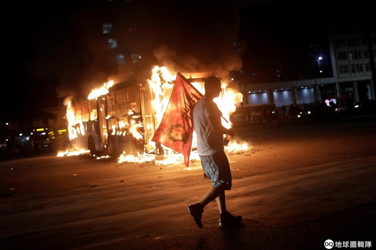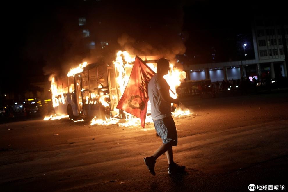 一名男子扛著印有巴西前總統魯拉(Luiz Inacio Lula Da Silva)的旗子,信步走過起火燃燒的巴士。他們走上街頭,是因為極右翼總統波梭奈羅(Jair Bolsonaro)所領導的政府打算削減高等教育機構的聯邦預算。