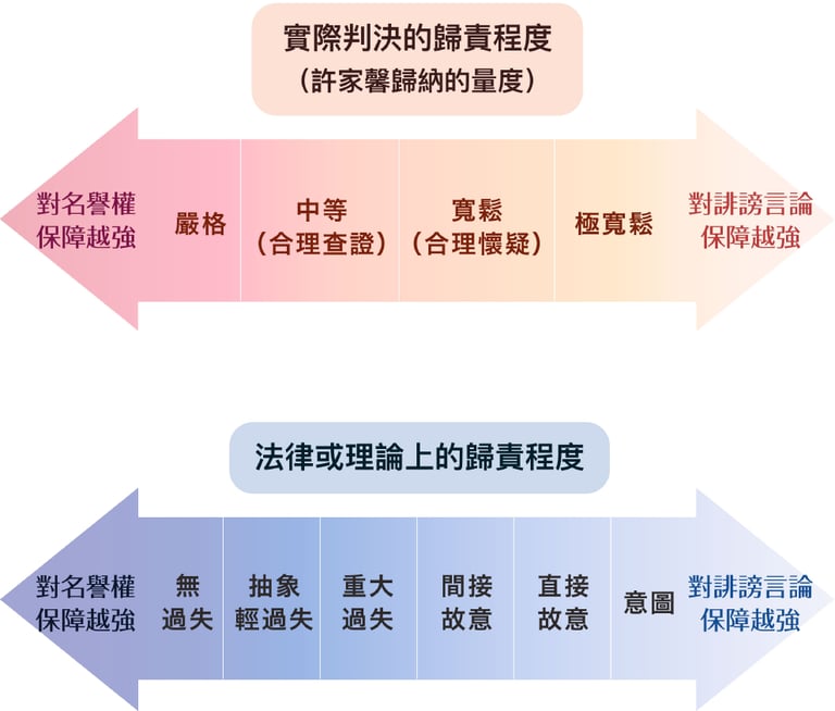 刑事的誹謗,罪責重、非難性也高,容易引發「寒蟬效應」的危險,因此採取對於言論管制較寬鬆的「真實惡意」原則──只處罰惡意空穴來風的造謠;而在非難性較低、著重合理分配損害與風險的民事名譽侵權,就使用著重客觀行為規範的「合理查證」模式──輕率的發言必須承擔賠償責任。