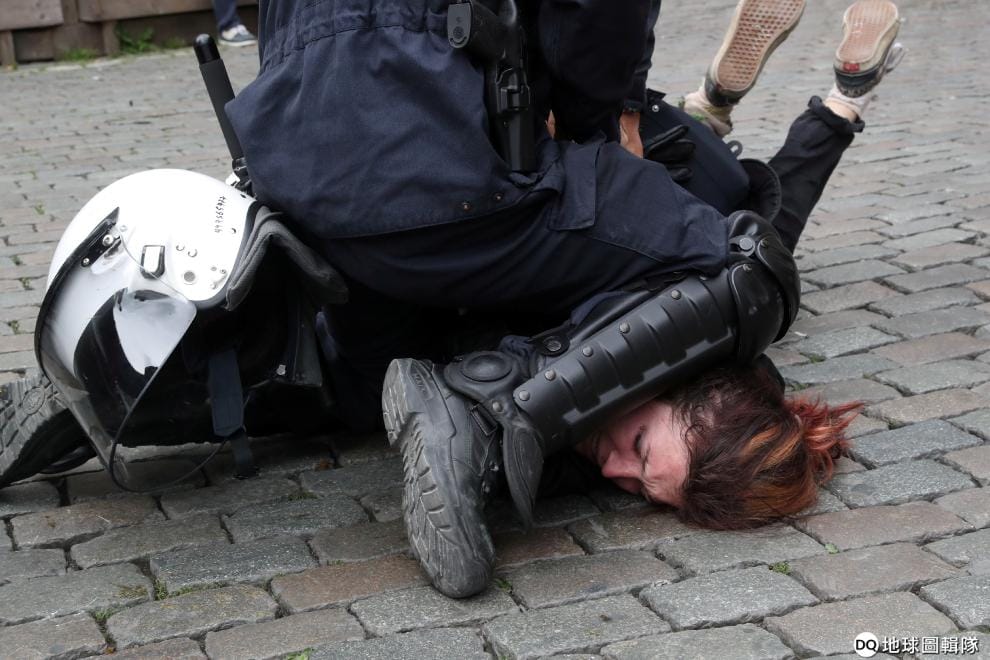 在布魯塞爾,一名「黃背心運動」(yellow vests)的抗議者在歐洲議會大選的最後一天遭到鎮暴警察的壓制。