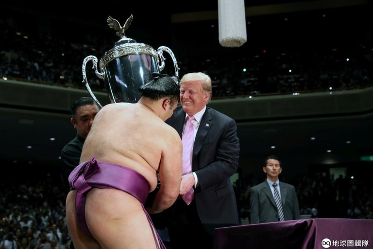 在東京的兩國國技館,正在當地出訪的美國總統川普(Donald Trump)將總統獎盃頒給日本夏季相撲錦標賽冠軍、今年 25歲的朝乃山英樹(Asanoyama Hideki)。