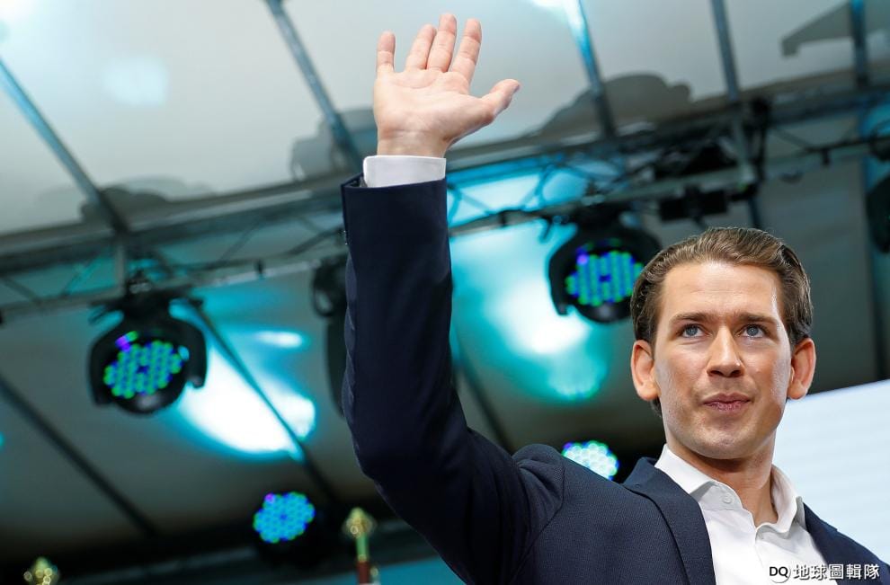在維也納的人民黨(ÖVP)總部,奧地利總理庫爾茨(Sebastian Kurz)在參與完歐洲議會大選後,對著群眾打招呼致意。