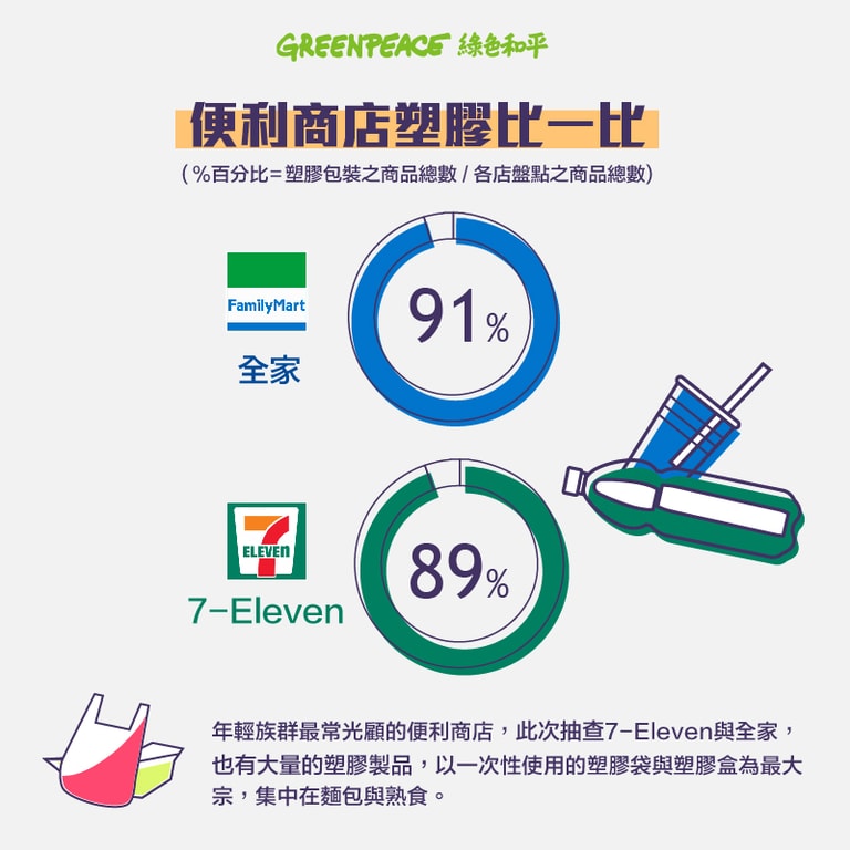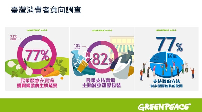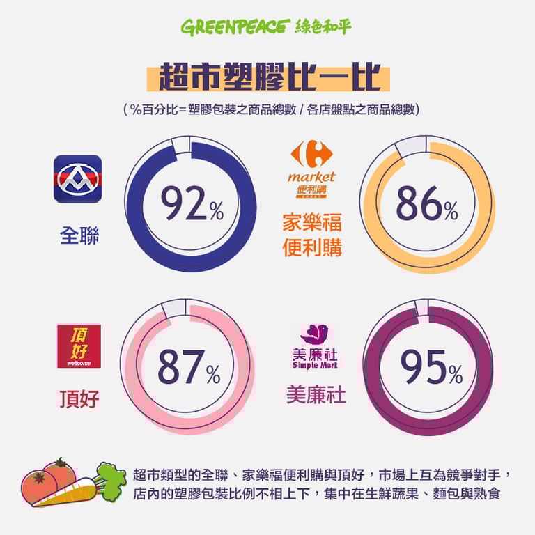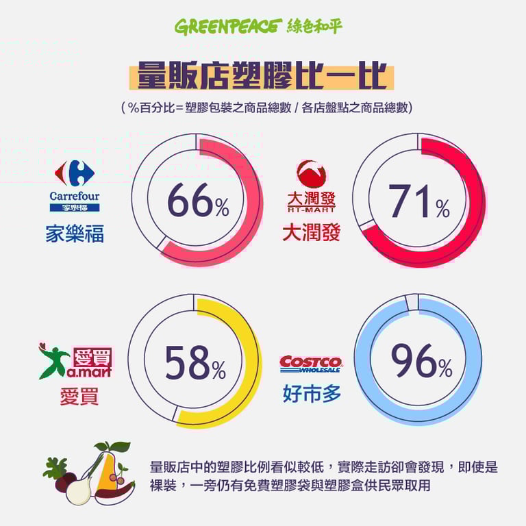 今年三月,【綠色和平】走訪全台灣 70家賣場,分別是家樂福、大潤發、好市多、愛買、家樂福便利購、全聯、頂好、美廉社、7-Eleven跟全家,特地針對賣場裡的四大區域:生鮮蔬果、烘焙、熟食與蛋類進行調查,發現有 77%的產品都有使用塑膠包裝。