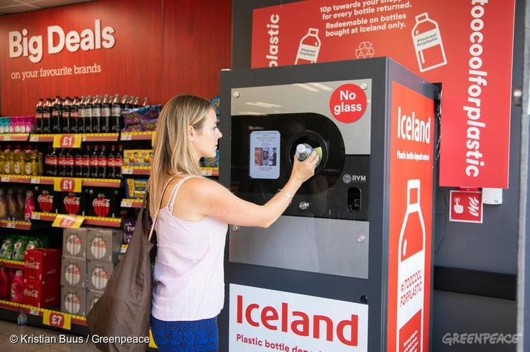 走一趟冰島連鎖超市,會發現有不少產品的包裝已經從一次性塑膠改為棉質網袋、回收紙、紙漿托盤和紙袋。不僅如此,在冰島超市內可以找到塑膠瓶回收機,顧客只要將塑膠瓶投入機器中回收就可以獲得回饋金,並且在購物時折抵使用。
