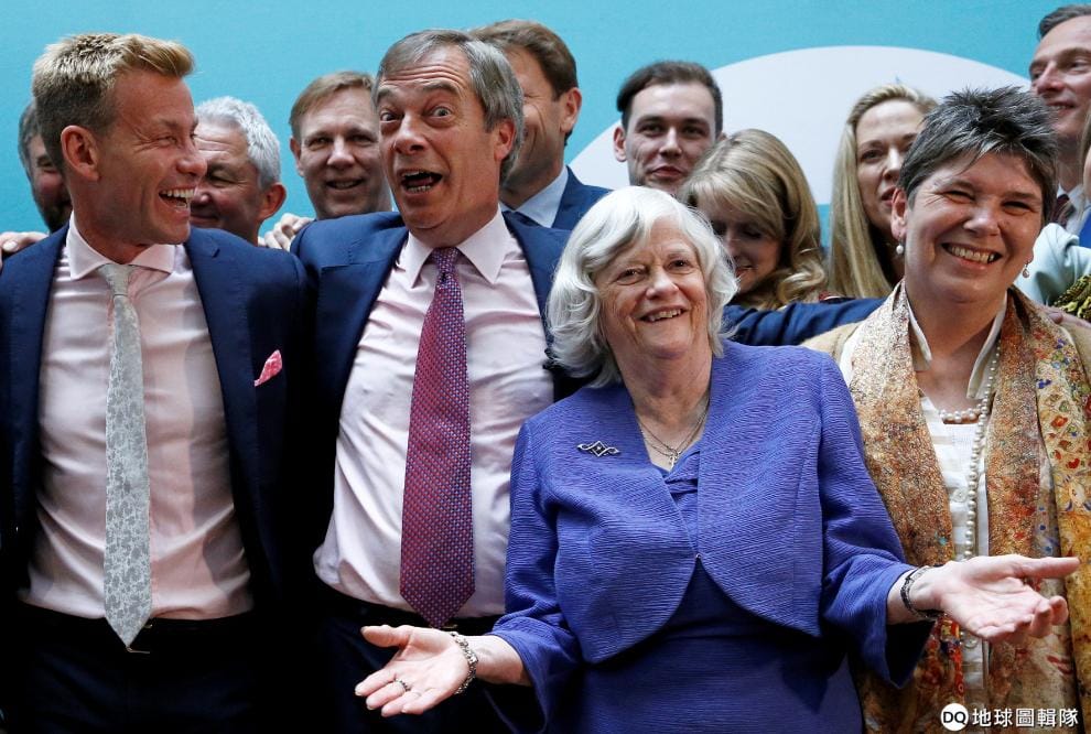 在歐洲議會大選結果出爐後,英國脫歐黨(Brexit Party)黨魁法拉吉(Nigel Farage,左二)帶著當選的議員召開記者會,他所帶領的脫歐黨在 2019年歐洲議會改選中拿下 29個席次。法拉吉原為英國獨立黨(UKIP)黨魁,並在 2016年6月的英國脫歐公投中扮演了重要的角色。