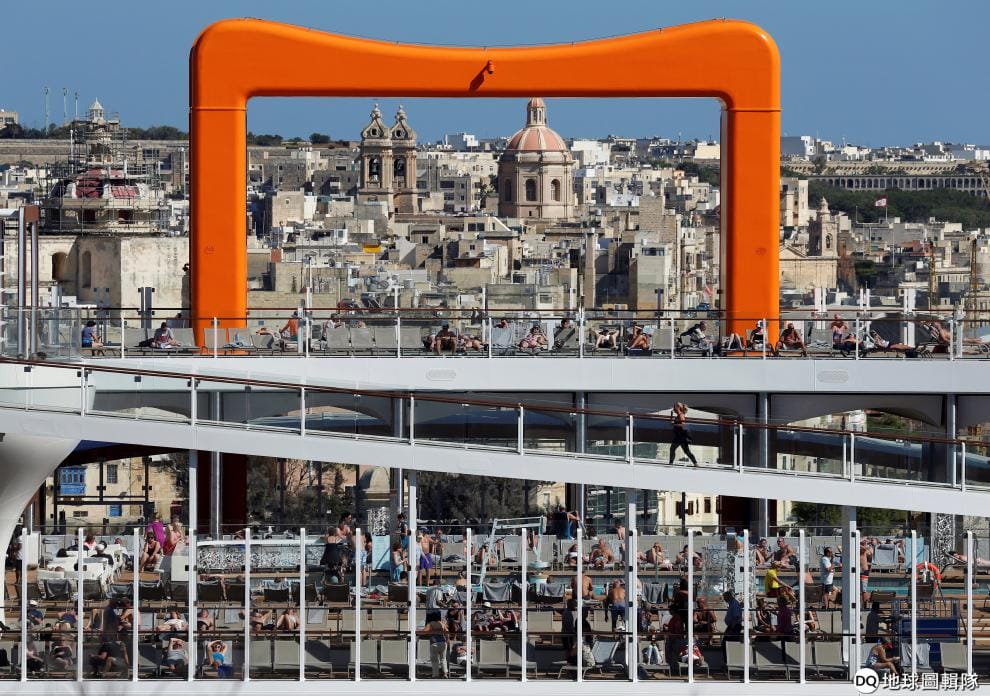 在靠近首都瓦萊塔(Valletta)的大港(Grand Harbour),搭乘菁英遊輪(Celebrity Edge)的乘客在遊輪甲板上悠閒做日光浴。