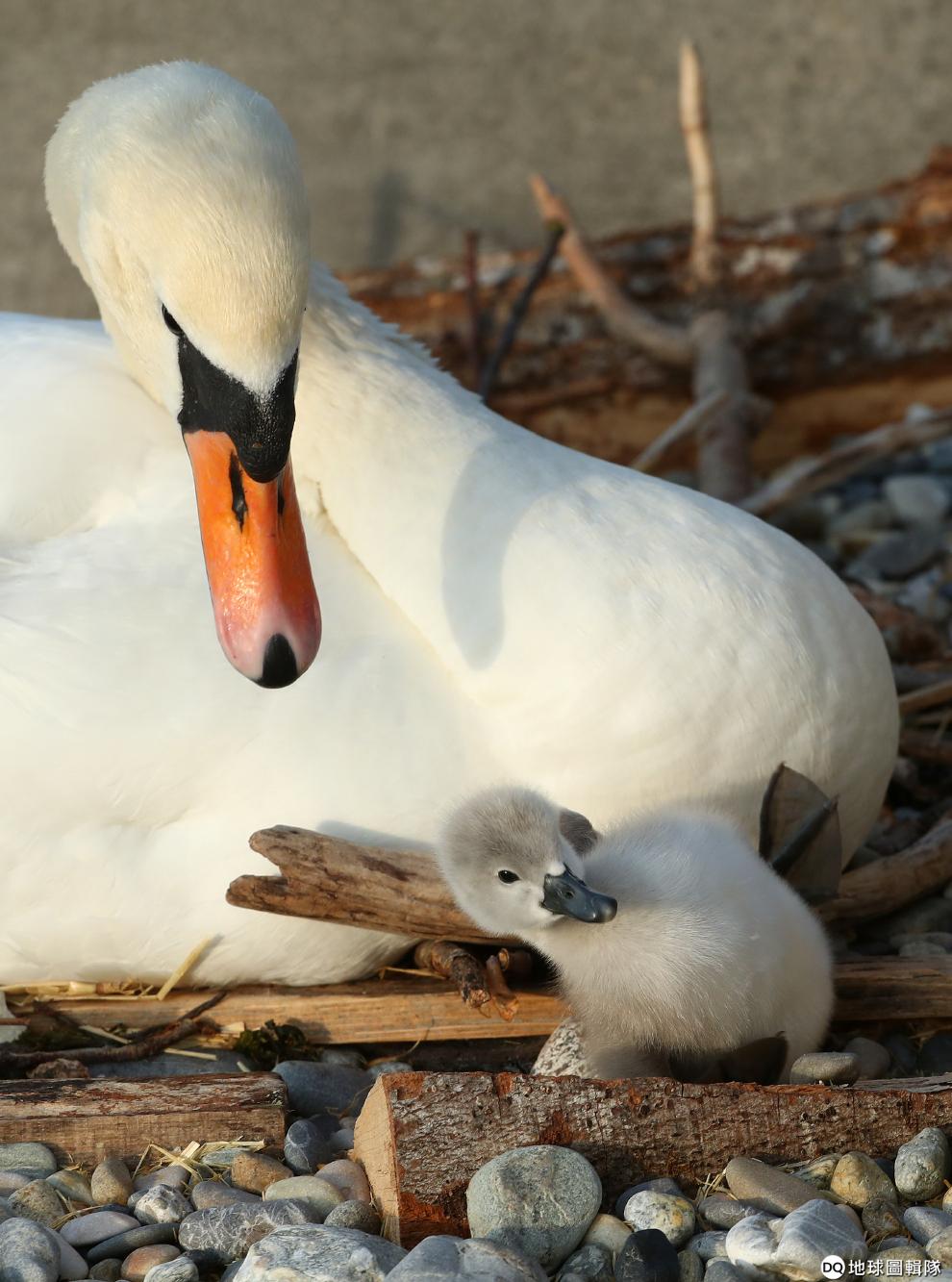在日內瓦的帕基斯浴場(Bains des Paquis)公園,可以看到一隻小天鵝在一身雪白的成年天鵝前搖搖擺擺地走路。