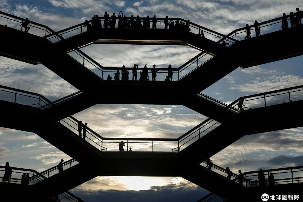 在紐約市西城的哈德遜城市廣場,民眾走在由 155座樓梯組成的大型公共藝術雕塑「血管」上。