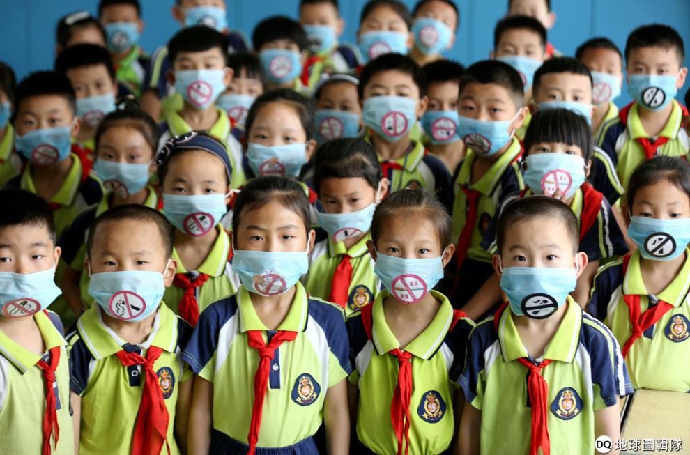 在無菸日這天,中國山東省臨沂市的小學生們戴上反菸口罩宣傳。