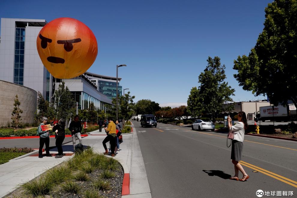 在 2019Facebook年度股東會的會場外,抗議Facebook失控的民眾升起了怒氣表情符號氣球示威。