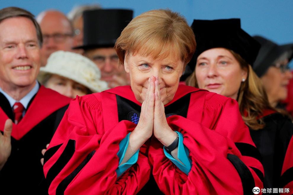在哈佛大學第 368屆的畢業典禮上,獲頒榮譽法學博士的德國總理梅克爾(Angela Merkel)雙手合十答謝大家的掌聲。
