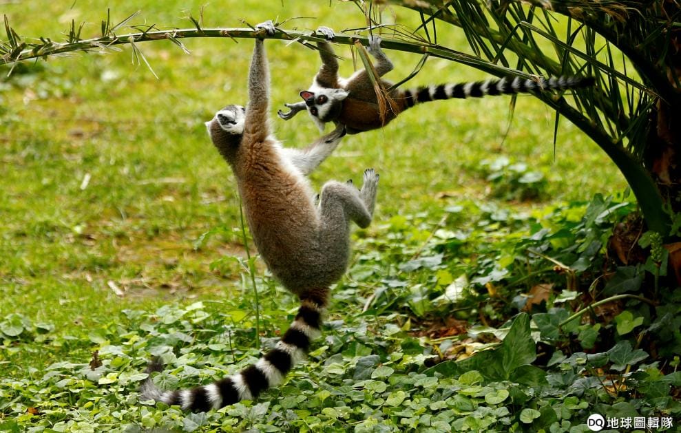 在羅馬的一座動物園內,一隻剛出生的環尾狐猴倒吊著爬上了樹枝。