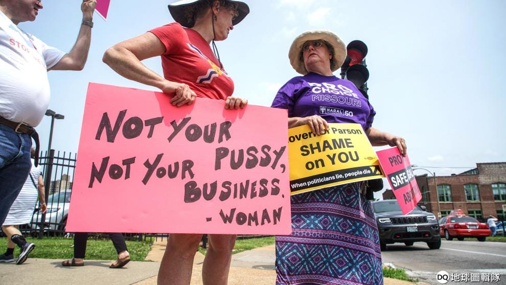 在密蘇里州(Missouri)聖路易市(St. Louis),支持和反對墮胎的民眾站在密蘇里州唯一一家美國計劃生育診所(Planned Parenthood clinic)外抗議。支持女性有權墮胎的民眾(圖左)手拿寫有「不是你的陰部,不關你的事」和手拿寫有「你該感到羞恥」海報的反墮胎民眾(圖右)對峙。