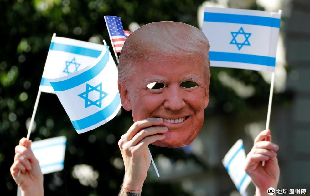 在柏林舉辦的挺以色列活動上,人們高舉著以色列國旗和美國總統川普(Donald Trump)的面具,這天也是紀念以色列在 1967年發動六日戰爭後,統一耶路撒冷的「耶路撒冷日」(Jerusalem Day)。