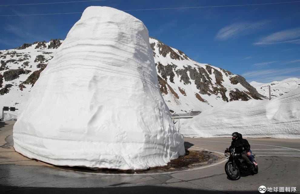 在山區的一條道路上,人們一邊騎著機車一邊繞過眼前的小雪山。隨著夏日的到來,原本積著厚雪的地方也開始逐漸融化。