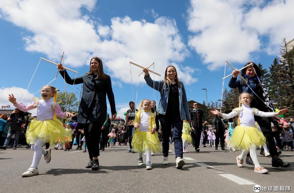 在城市克拉斯諾亞爾斯克(Krasnoyarsk),孩子們打扮成大人的操線玩偶,上街慶祝國際兒童節。
