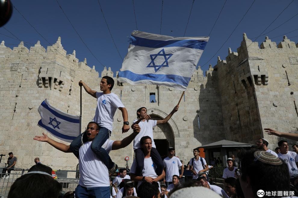 在耶路撒冷舊城區的大馬士革門前,聚集著手拿以色列國旗歡慶「耶路撒冷日」(Jerusalem Day)的民眾,這個日子專門紀念以色列在 1967年發動六日戰爭後,統一耶路撒冷。