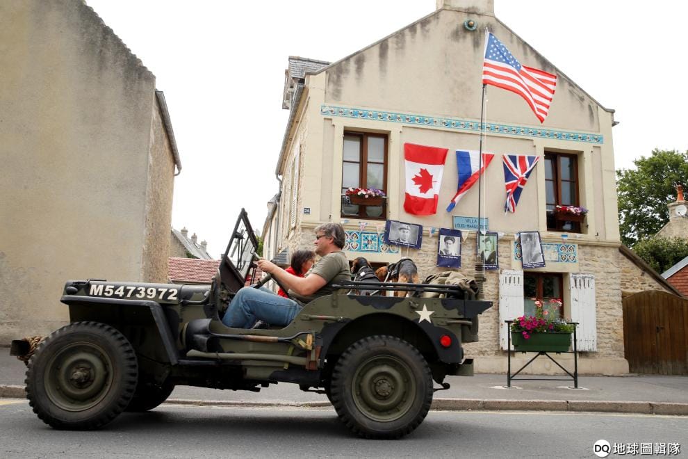 在 75年前上演諾曼地戰役的地點,前來紀念該戰役的民眾開著經典老吉普車,緩緩駛過掛有參戰國國旗的房舍。