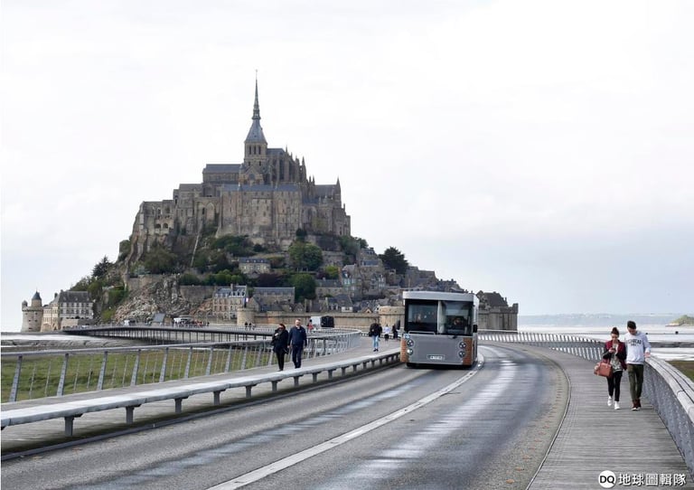 現在,你看到的是修剪整齊的樹籬圍著聖米歇爾教堂,人們不再需要鋼樑路,他們能穩穩地踩在鋪得平整的路面上。