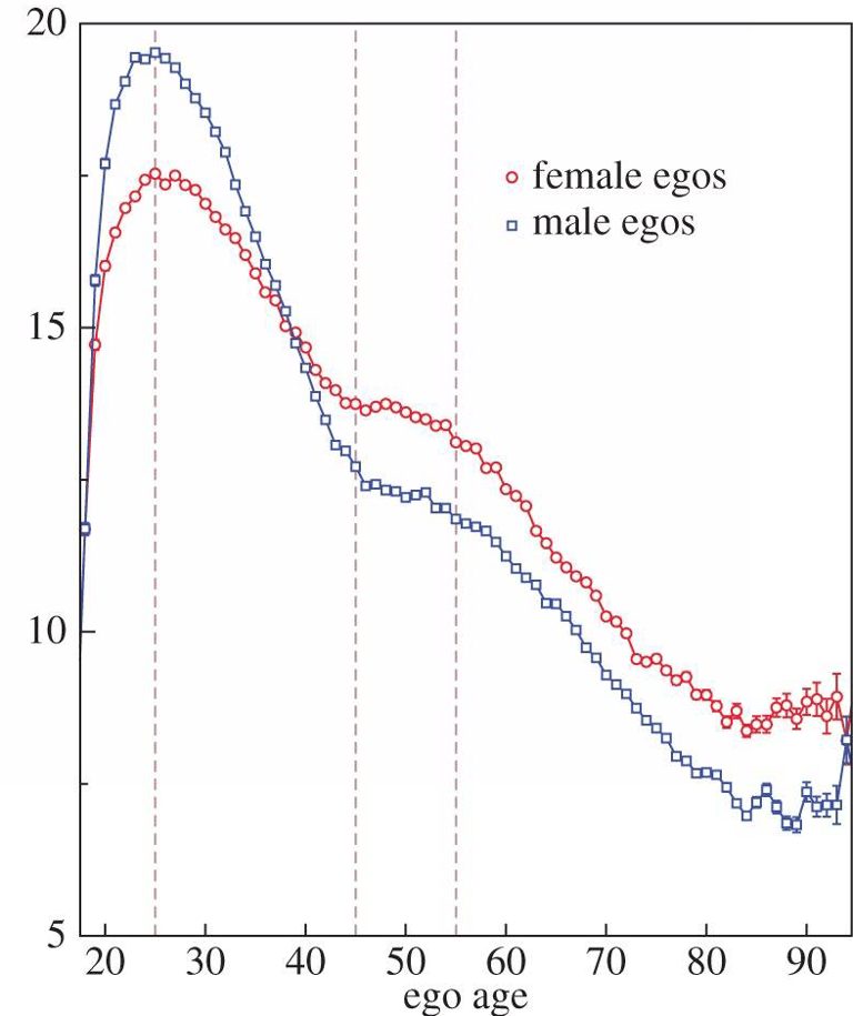 在 25歲之前,不論男女,其互動的人數會不斷攀升,並在 25歲來到高峰——平均女生會接觸 17.5人、男生則為 19人;但在接下來,他們的互動人數就會不斷往下掉,且男生的互動人數會超過女生,不過在 39歲時,女生的互動人數會反而會超過男生(女生 15人、男生 12人),一直到 80歲,兩者的差距才會逐漸消失,這時的女生平均會與 8人互動、男生則為 6人。